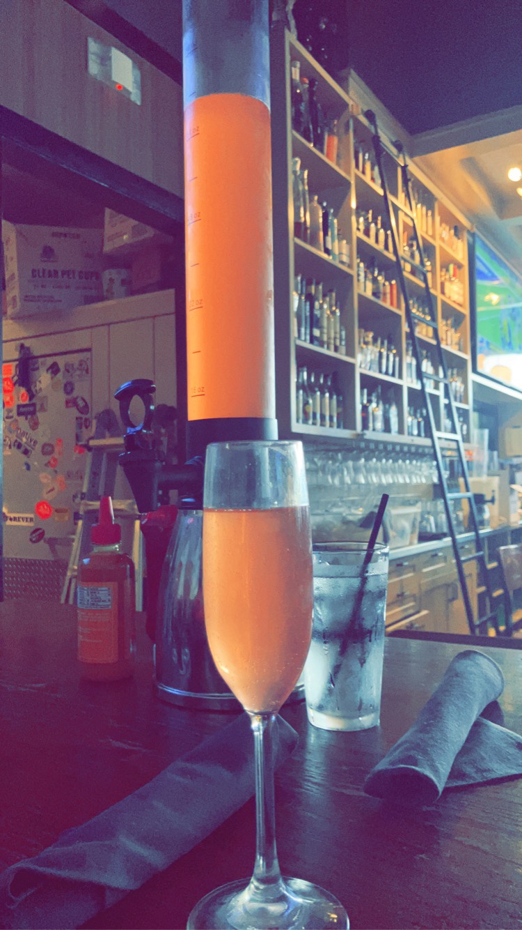 We started by ordering a mimosa tower. Now, there is a smaller version of this tower called the Lil’ Kim which was about half this size but our waitress insisted the Biggie would do us justice. And THAT it did! This tower held 80oz of mimosa split 3 ways!! Oh, I was LIT! 😂